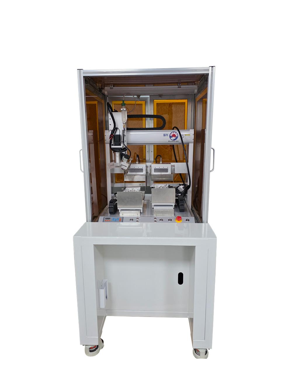 作業(yè)流程:中空旋轉(zhuǎn)平臺(tái)實(shí)現(xiàn)兩面點(diǎn)膠作業(yè),雙滑臺(tái)迴圈(Y1)前方點(diǎn)膠時(shí),后方(Y2)同時(shí)進(jìn)行固化提升效率